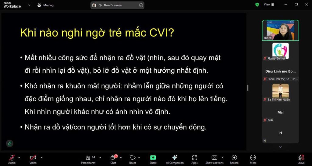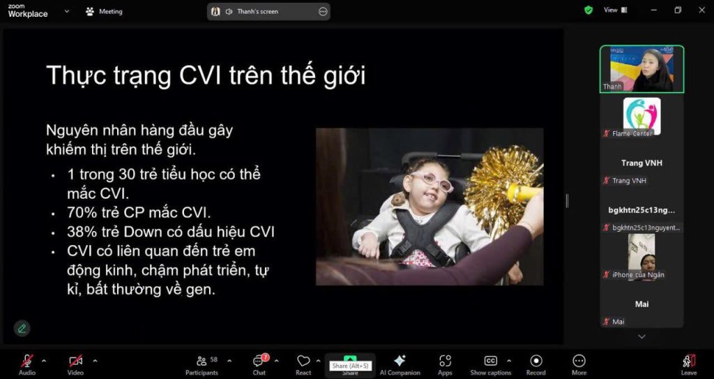 Tại buổi workshop, các học viên đã được tiếp cận những kiến thức cơ bản nhưng rất thiết thực về khiếm thị vỏ não (CVI). Đây là nguyên nhân phổ biến gây khiếm thị ở trẻ bại não (CP), ảnh hưởng đến quá trình học tập và phát triển của trẻ. Việc phát hiện sớm sẽ giúp trẻ có cơ hội tiếp cận phương pháp can thiệp phù hợp.
