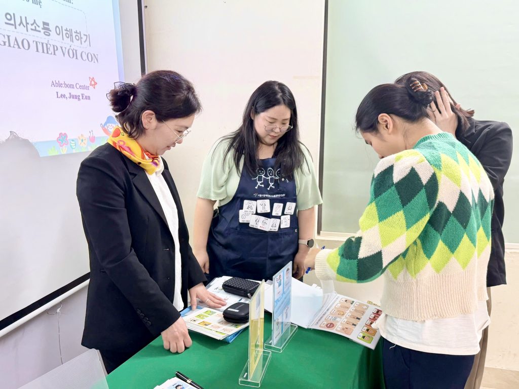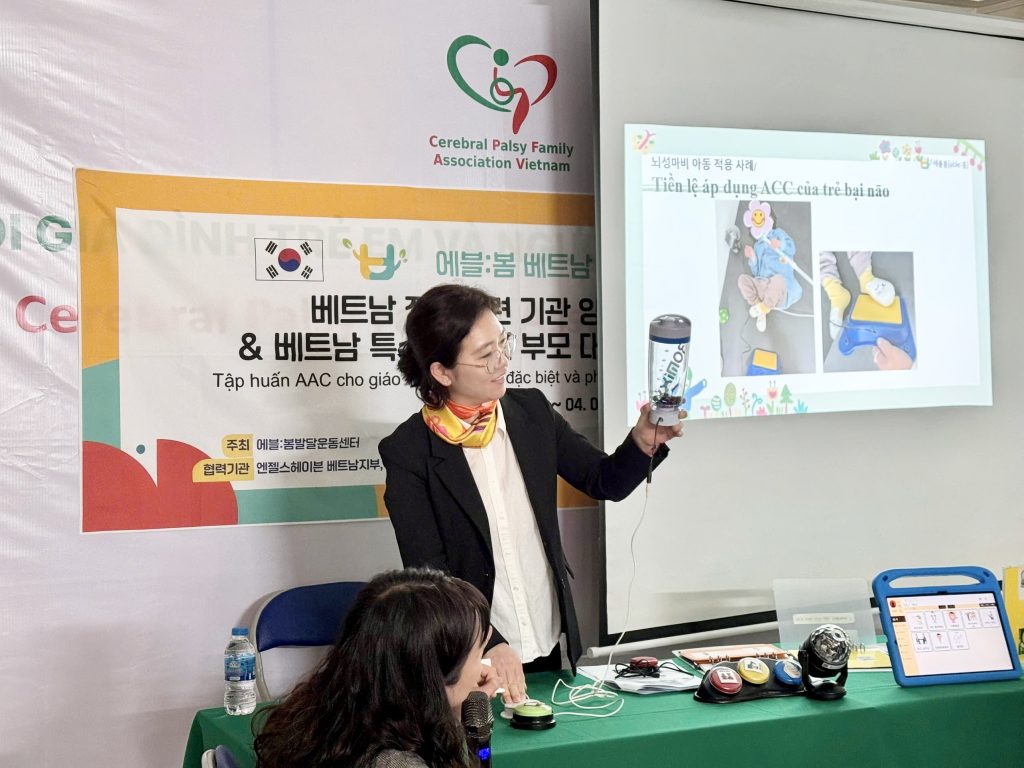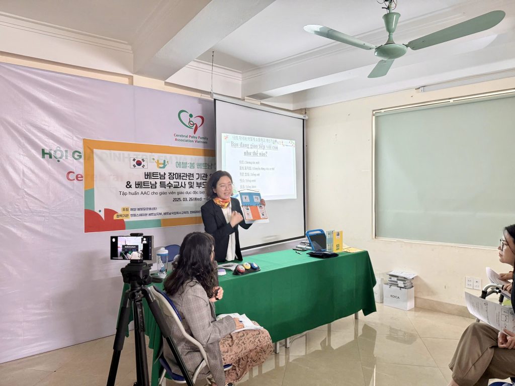 Trong buổi tập huấn, Chuyên gia Lee Jung Eun đã trình bày nhiều nội dung quan trọng, bao gồm: Câu chuyện giao tiếp của trẻ bại não, giới thiệu và hướng dẫn các phương pháp, công cụ hỗ trợ giao tiếp. Chuyên gia cũng đã giới thiệu đến các phụ huynh phương pháp giao tiếp tăng cường và thay thế (AAC) – các phương pháp đa dạng giúp hỗ trợ người gặp khó khăn trong biểu đạt, thay thế phương pháp ngoài lời nói và cải thiện khả năng giao tiếp. Đặc biệt, các phụ huynh đã có cơ hội quan sát cách các phương pháp và công cụ này được áp dụng thực tế cho trẻ em tại Hàn Quốc thông qua những video.
