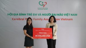 Tại buổi lễ, đại diện của công ty JMB đã trao tài trợ cho bà Trần Thị Huyền Trang – PGĐ phụ trách Quỹ Bảo trợ trẻ em bại não GoGreen4CP.
