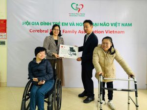 SINH VIÊN CÂU LẠC BỘ ROTARACT – ĐẠI HỌC CHUO (NHẬT BẢN) TRAO XE LĂN CHO TRẺ BẠI NÃO TẠI VĂN PHÒNG CPFAV