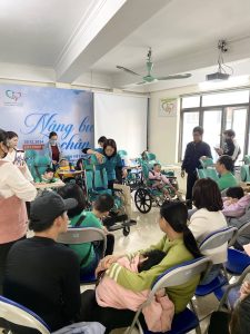 Bên cạnh đó, các gia đình tham dự cũng đã được Đại diện của Trung tâm Giáo dục Chăm sóc Sức khỏe Cộng Đồng Ngôi Sao Xanh (GreenStar) trực tiếp hướng dẫn cách sử dụng xe lăn để đảm bảo hỗ trợ đúng đắn và hiệu quả nhất cho trẻ bại não.