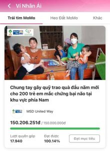 Chương trình gây quỹ 200 phần quà cho những trẻ em mắc chứng bại não tại khu vực phía Nam trên trái tim MOMO đã đạt được mục tiêu gây quỹ