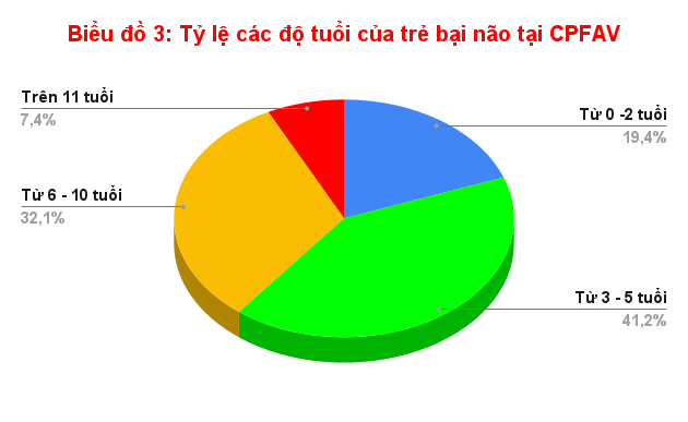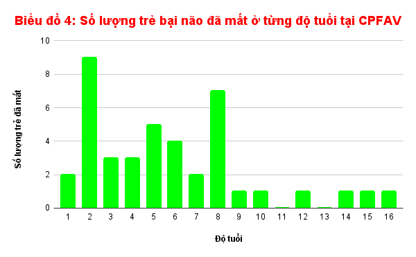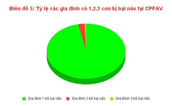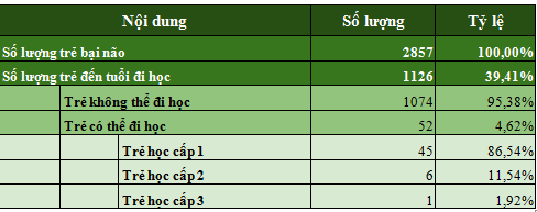 Trong độ tuổi 0-16 tuổi, Thống kê cho thấy có 2.687 gia đình có 1 trẻ bại não (chiếm 97,004%) , 79 gia đình có 2 trẻ bại não (chiếm 2,852%) và 4 gia đình có 3 trẻ bại não (chiếm 0,144%)
