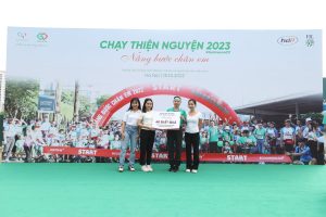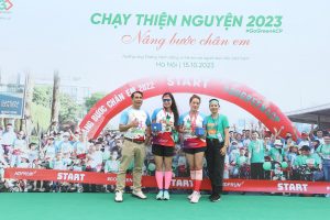 Ông Nguyễn Thắng Lợi – Đại diện Công ty HDP và Công ty FIL Việt Nam và bà Vũ Thị Huyên – Phó Giám đốc Doanh nghiệp xã hội GoGreen, Uỷ viên BCH CPFAV trao giải cho các vận động viên đạt giải hạng mục Cự ly 5km Cá nhân Nữ