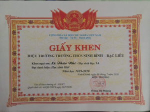 - Lê Thảo Nhi, Ninh Bình – Học sinh Giỏi, giải Nhì môn Hóa cấp thành phố, đỗ vào cấp 3 chuyên Hóa tỉnh Ninh Bình