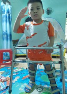 Trước phẫu thuật: Chân co rút chỉ bò, chưa đứng đi, cơ thân mình rất yếu, chưa quỳ được 2 điểm