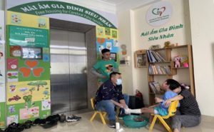 Trẻ bại não và gia đình lưu trú tại Mái ấm khi đến Viện Nhi phẫu thuật