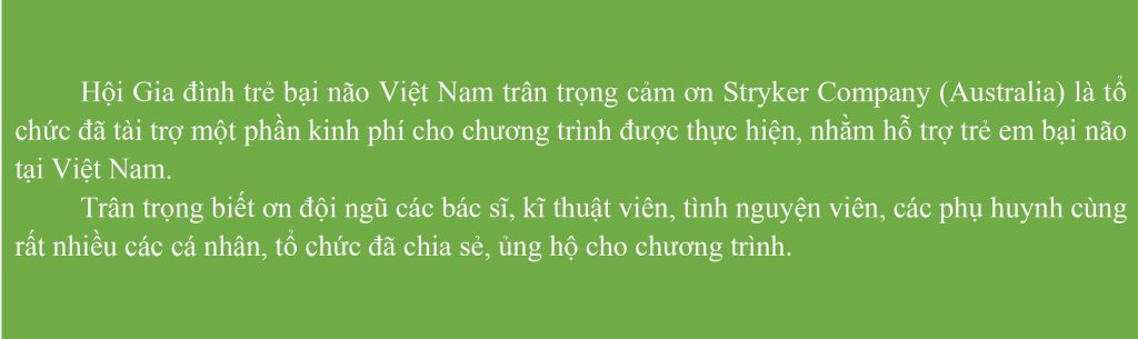 Từ tháng 2/2023 đến tháng 4/2024, chương trình đã được Stryker Company (Australia) tài trợ và trích từ Quỹ của Hội Gia đình trẻ bại não Việt Nam.