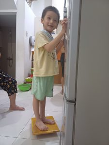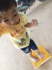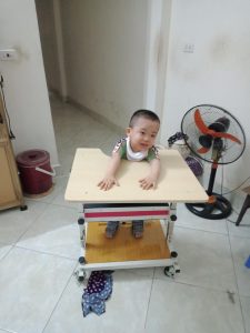Em Lương Trọng Phúc (2018) ở thành phố Hồ Chí Minh mắc chứng bại não, hiện em đã biết đi nhưng thăng bằng còn kém. Trong khuôn khổ của dự án “Thoát khỏi sàn nhà 2023”, em nhận được dụng cụ số 427 – Bập bênh chữ nhật nhỏ, hỗ trợ quá trình tập luyện để em cải thiện thăng bằng của bản thân.