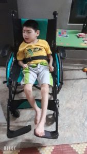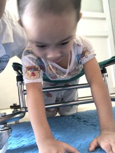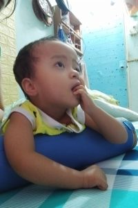 Em Nguyễn Quốc Khánh (2016) ở Thanh Trì, Hà Nội. Em bị bại não, đang trong giai đoạn tập ngồi. Em rất vui khi nhận được dụng cụ số 411 – Nón bảo vệ đầu cho trẻ bại não của dự án “Thoát khỏi sàn nhà 2023”.