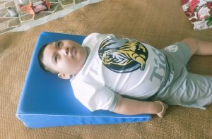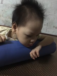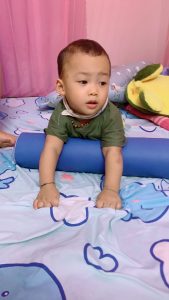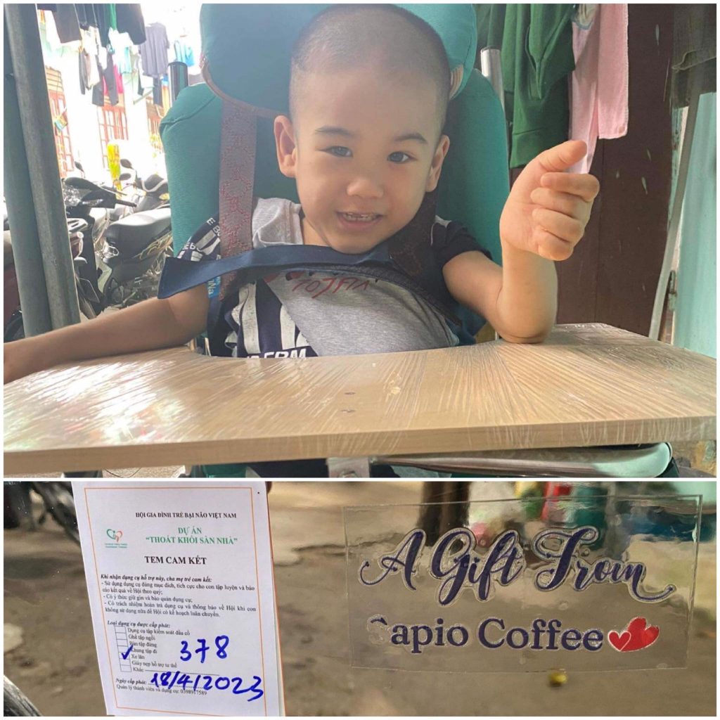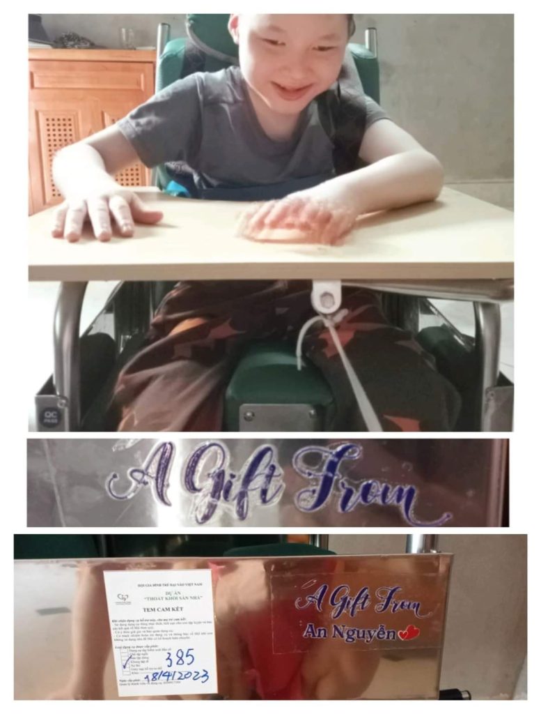 Em Hoàng Hữu An Tường (2014) ở Đông Hà, Quảng Trị nhận dụng cụ số 418 – Trục lăn sơ sinh của dự án “Thoát khỏi sàn nhà 2023”. Em bị bại não, đang trong giai đoạn tập ngồi.