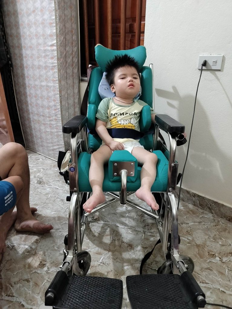 Trao dụng cụ số 433 – Ghế tập ngồi số 1 của dự án “Thoát khỏi sàn nhà 2023” cho em Nguyễn Hải Đăng (2020) ở Hoàng Mai, Hà Nội. Em bị bại não, 3 tuổi chưa ngồi vững, chưa đứng được, đang tập ngồi. Mẹ phải ở nhà chăm con kinh tế phụ thuộc vào bố. Hoàn cảnh gia đình khó khăn.