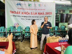 Nhân kỷ niệm 25 năm ngày Người khuyết tật Việt Nam, ngày 18/4/2023 đã diễn ra buổi trao tặng xe lăn cho trẻ bại não thuộc chi hội Thanh Hóa và Hòa Bình. Đây là hoạt động nằm trong khuôn khổ dự án “Thoát khỏi sàn nhà” – khám đánh giá và hỗ trợ dụng cụ cho trẻ bại não có hoàn cảnh khó khăn, được CPFAV triển khai từ năm 2018. Từ tháng 5/2022, chương trình có sự đồng hành của Quỹ Bảo trợ trẻ em bại não GoGreen4CP.