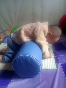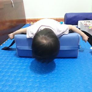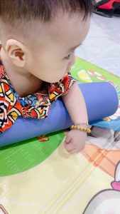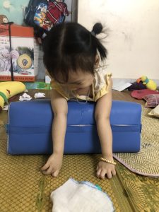 Em Nguyễn Phạm Bảo Ngọc (2019) ở Thanh Trì, Hà Nội nhận dụng cụ số 430 – Trục lăn của dự án “Thoát khỏi sàn nhà 2023”. Em bị bại não, cổ yếu, đang trong giai đoạn tập ngồi.
