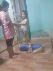 Em Vi Bảo Trân (2015) ở Chí Linh, Hải Dương nhận dụng cụ số 416 – Trục lăn của dự án “Thoát khỏi sàn nhà 2023”. Em bị bại não, đang trong giai đoạn tập đứng.