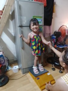Em Hoàng Nguyễn Bảo Anh (2017) ở Thanh Xuân, Hà Nội nhận được dụng cụ số 431 – Bập bênh chữ nhật nhỏ của dự án “Thoát khỏi sàn nhà 2023”. Em bị bại não, đã đi được nhưng thăng bằng còn kém