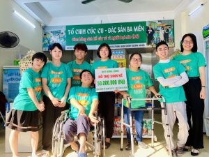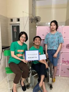 Chị Đinh Thị Lan Anh – Chủ tịch Hội Gia đình trẻ bại não Việt Nam thay mặt cho các mạnh thường quân trao hỗ trợ cấp vốn cho Tổ chim Cúc cu thành lập gian hàng tháng 6/2022