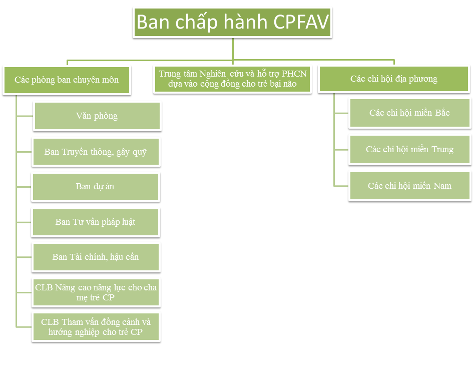 Hiện nay, CPFAV là một cộng đồng lớn có uy tín của hơn 5000 gia đình trẻ em và người bại não tại Việt Nam. CPFAV có trụ sở tại Hà Nội, mạng lưới 63 Chi hội trực thuộc, 3 câu lạc bộ và 01 Doanh nghiệp xã hội Vì trẻ bại não Việt Nam (CPFAV CO., LTD) – đại diện pháp lý cho CPFAV.