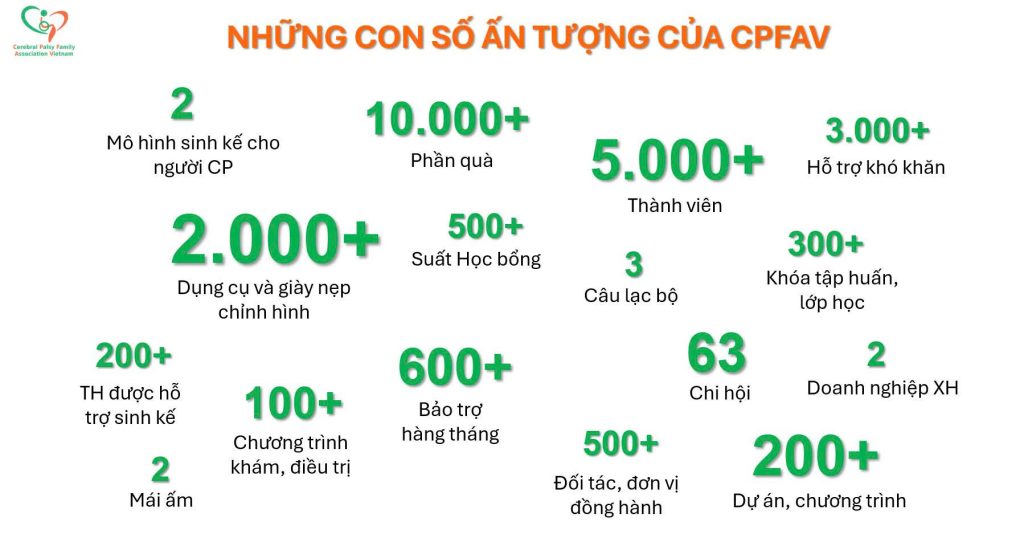 - Xây dựng CPFAV là tổ chức đầu tiên và duy nhất về bại não (CP) ở Việt Nam, tổ chức uy tín, bền vững với cơ cấu tổ chức, vận hành chặt chẽ, đại diện chính thức cho các gia đình trẻ em và người bại não Việt Nam, trở thành thành viên thường trực trong Ban chấp hành Liên hiệp hội về người khuyết tật Việt Nam và đại diện cho tiếng nói của người CP Việt Nam trên trường quốc tế.