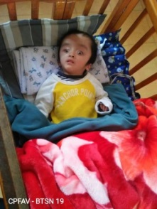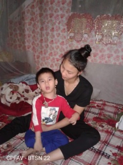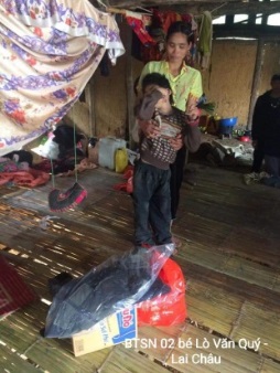 Em bị khuyết tật đặc biệt nặng, chỉ nằm 1 chỗ, không nói được. Chị gái em cũng bị bại não và đã mất tháng 6/2021. Bố mẹ em đã ly hôn, em sống cùng bà nội người dân tộc Nùng, bà không có việc làm ổn định. Gia đình thuộc hộ nghèo của địa phương.